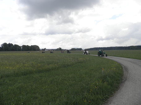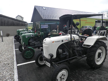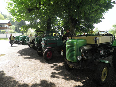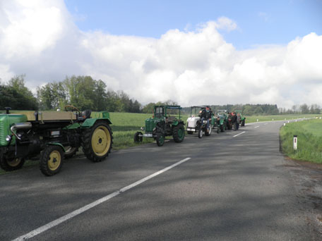 | Am 4.Mai war es soweit. Das Erste mal nach der langen Pause wieder einmal einige Runden drehen mit dem Traktor .Ich wurde oft gefragt wann fahren wir denn einmal wieder ? Der Vorfrühling war ja herrlich, aber nichts desto trotz man sollte nichts überstürzen . Das Wetter an diesem Sonntag war eher ungünstig. Es war Kalt nein Saukalt aber es sah aus Trocken zu bleiben. Es fanden sich nur 7 Traktoren ein zur Fahrt . Pünktlich ging es dann los | ||