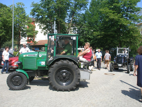 | Am Ziel angekommen stellten wir uns auf die zur verfügung gestellten Parkplätze. Dieses Treffen war nicht für Traktoren gedacht sondern für Zweiräder und Autos. Aber nichts desto trotz würden unsere Steyr bestaunt. |