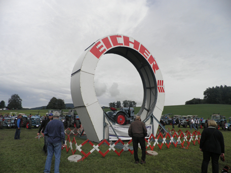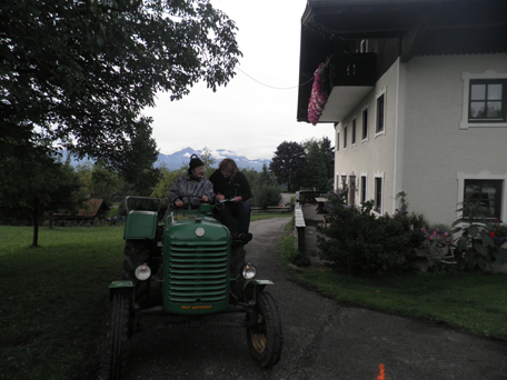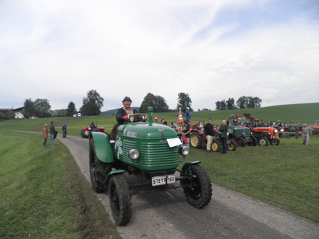 | Sonntag 9.00 Uhr 15. September leichter Nieselregen Abfahrt mit 4 Traktoren Wir fuhren im Oichtnertal richtung Haunsberg vorbei an der Kaiserbuche auf hinterwegen nach Anthering . Am Haunsberg begann die Sonne zu scheinen. Als wir ankamen mußten wir sofort zum Fotoshouting , wo wir sofort eine Urkunde mit dem eigenen Foto überreicht bekamen . | ||
